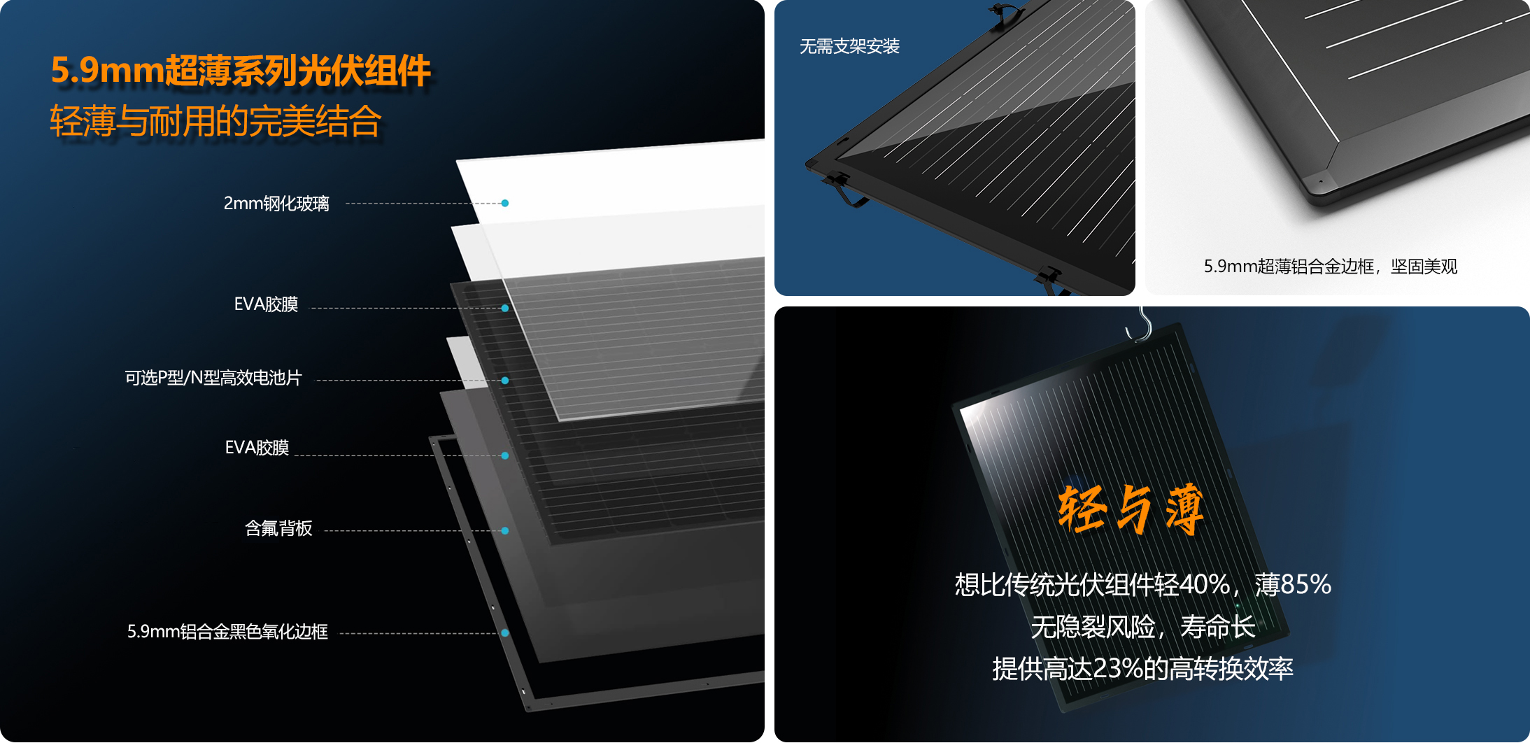 刀锋超薄光伏组件采用高效的单晶电池片(可选P型或N型),2mm钢化玻璃,5.9mm厚的铝合金边框制成,塑料角码和边框一体,使得产品坚固耐用,他比常规组件重量轻,比柔性组件强度高。
