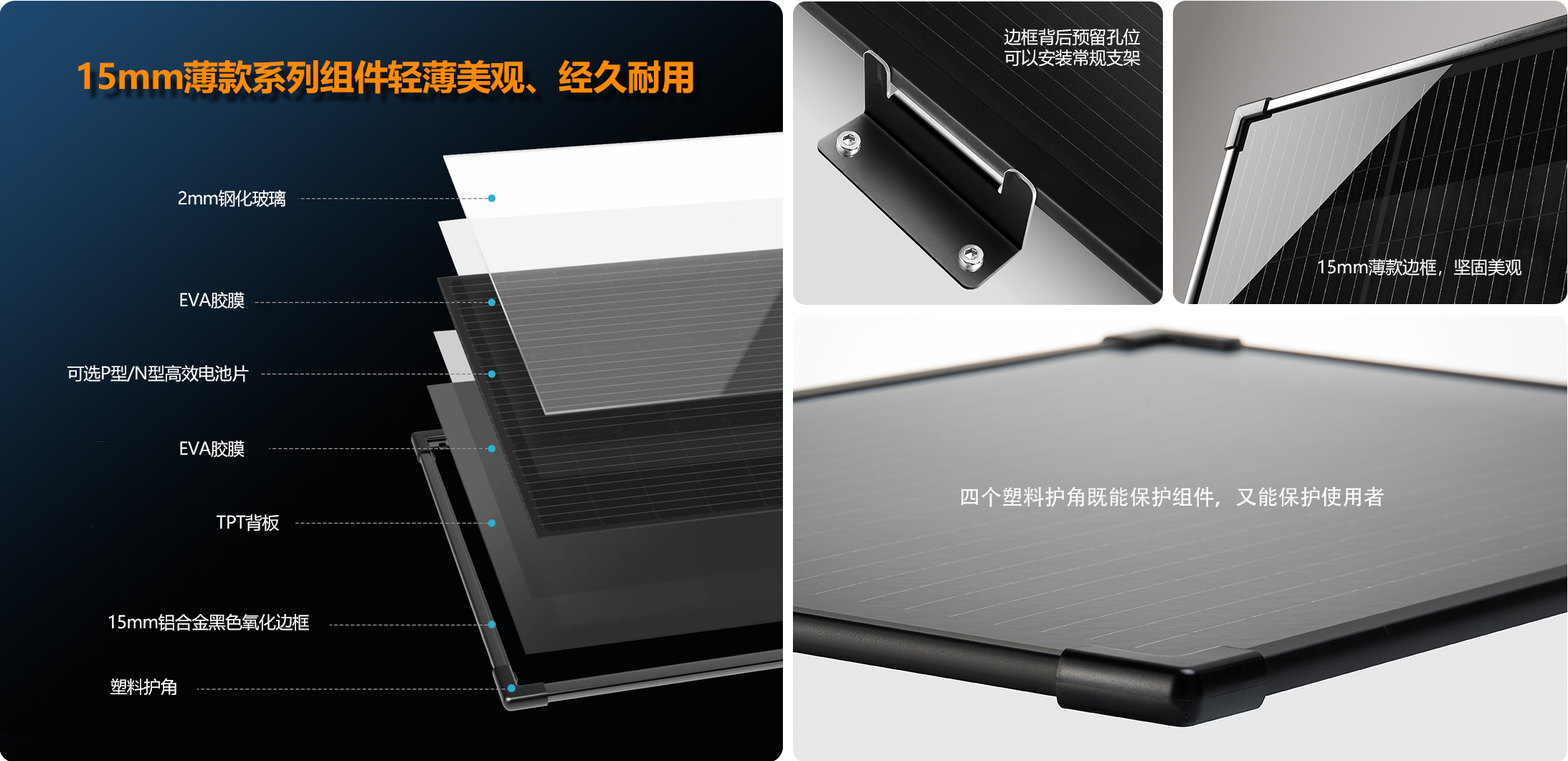 薄款光伏组件采用高效的单晶电池片(可选P型或N型),2mm钢化玻璃,15mm厚的铝合金边框制成,塑料装饰护角使得产品整体呈现一种简洁高雅的特质。薄款光伏组件主要用于房车、轮船、帆船、游艇、卡车、机舱、露营车、帐篷、拖车、高尔夫球车等场合。