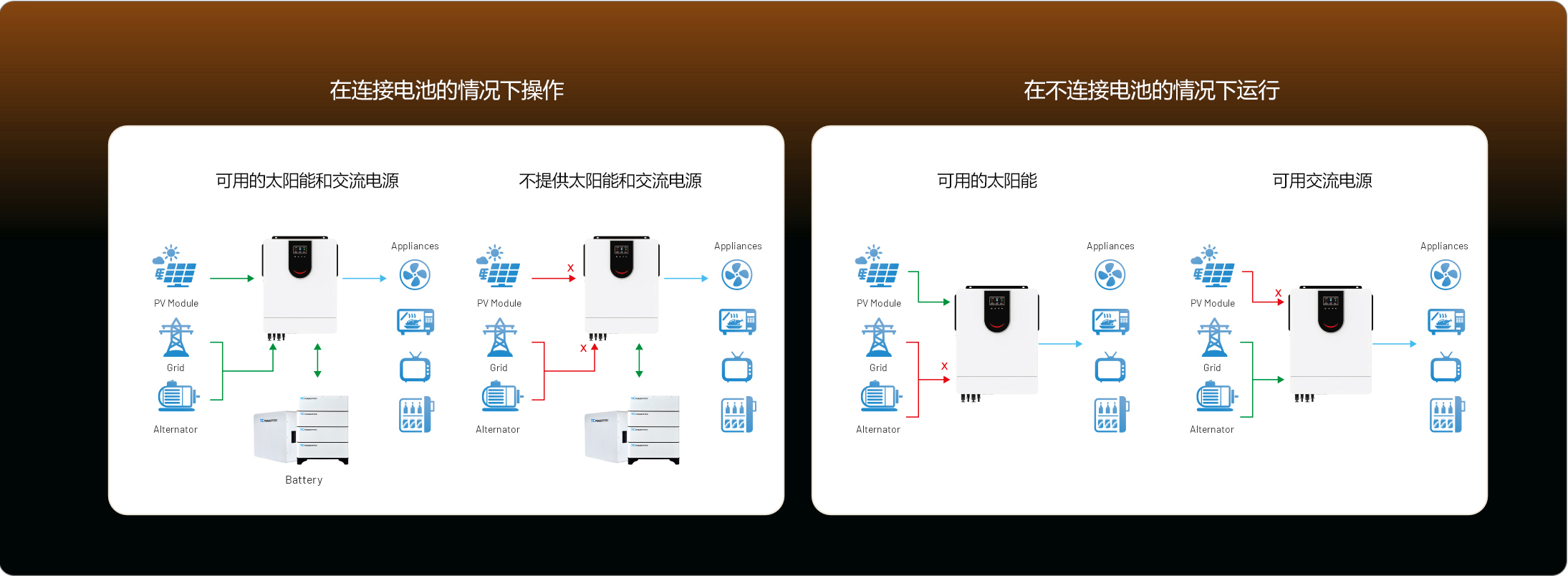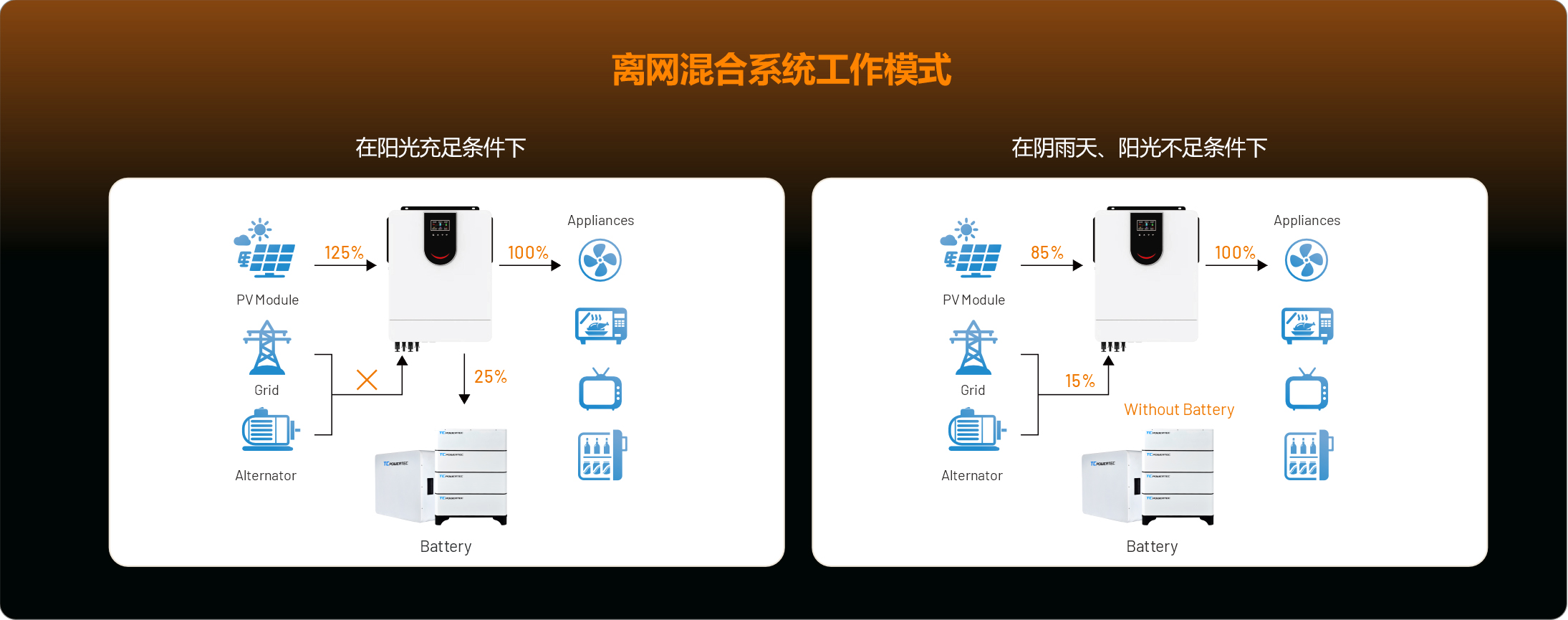 混合系统指的是发电系统中除光伏之后,还存在其他供电设备。如风力发电光伏发电互补系统(简称风光互补系统)、光伏与市电互补系统、光伏与柴油机互补系统、风光柴电互补系统等。通过混合控制器和蓄电池及逆变器等组件,实现电能的存储和转换。混合系统的主要目的是提高供电的稳定性和可靠性,通过互补不同能源的优点,减少单一能源的局限性,从而适应各种环境和气候条件下的电力需求。这种系统特别适用于电力基础设施不完善或不稳定的地区,能够提供持续、可靠的电力供应。