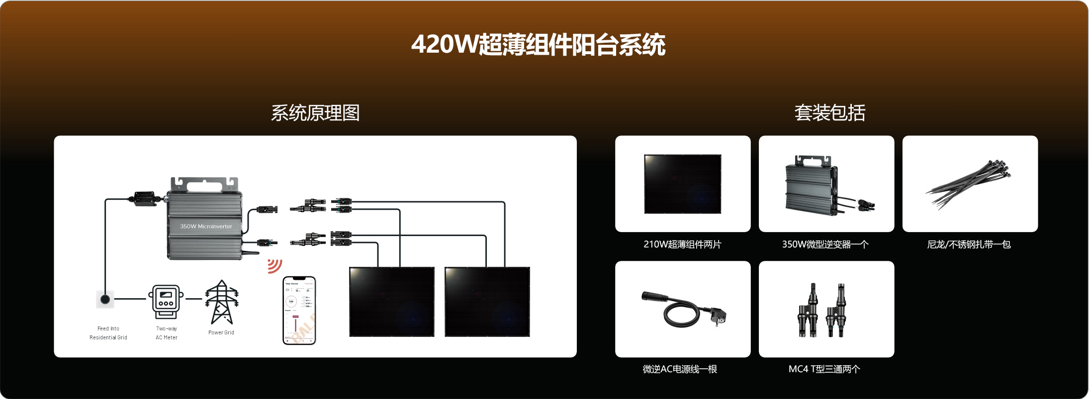 阳台光伏系统采用刀锋超薄光伏组件,机械强度高,重量轻,无需支架,直接通过扎带安装在阳台上。光伏组件连接微逆,插上电源就可以发电了。光伏组件所发的直流电通过电缆传输到微逆,逆变器将直流电转换为交流电,接入家庭配电箱,供家庭电器使用。如果家庭用电量小于光伏系统发电量,多余的电能可以通过双向电表反馈给电网,实现电能的储存或出售;如果家庭用电量大于光伏系统发电量,则由电网补充不足的部分。